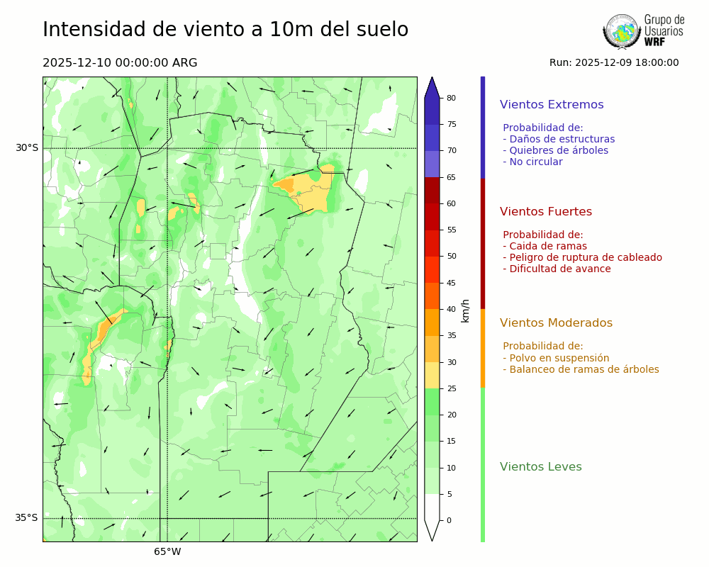 • Intensidad máxima: 10.20 km/h (10/12/2025 02hs.)