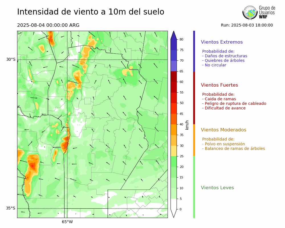 • Intensidad máxima: 7.49 km/h (04/08/2025 05hs.)